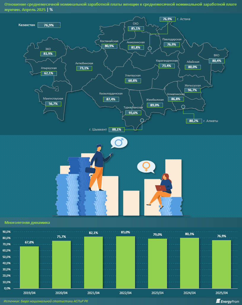 По данным на апрель 2024 года, женщины в Казахстане зарабатывают в среднем 76,9% от уровня заработной платы мужчин, что свидетельствует о значительном гендерном разрыве. Динамика последних лет показывает, что в 2019 году этот показатель составлял всего 67%, а в 2022 году достиг максимума в 83%. Однако после этого последовал откат: в 2023 году разрыв сократился до 79%, а в 2025 году он снова увеличился. В 2025 году женщины составляют 47,9% всех занятых в экономике Казахстана, однако вопрос гендерного равенства в оплате труда остаётся актуальным.