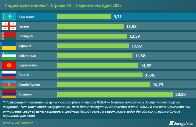 Индекс цен на недвижимость* в РК составил 9,7. Чем ниже этот коэффициент, тем более доступным считается жильё. Для сравнения: в России индекс составил 15,45, в Кыргызстане — 14,64, в Узбекистане — 13,58, в Беларуси — 12,59, в Армении — 20,89.