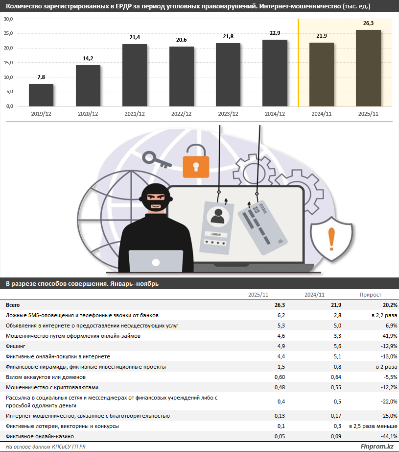 Однако официальная статистика демонстрирует иную расстановку сил. По данным Комитета по правовой статистике и специальным учётам Генеральной прокуратуры РК, за январь–ноябрь 2025 года наибольшее число уголовных правонарушений было связано с вишингом - телефонным мошенничеством, а также с рассылкой поддельных SMS якобы от банков и правоохранительных органов. Таких фактов зарегистрировано 6,2 тыс., или 23,5% от общего числа преступлений в этой сфере. По сравнению с аналогичным периодом 2024 года их количество выросло в 2,2 раза.