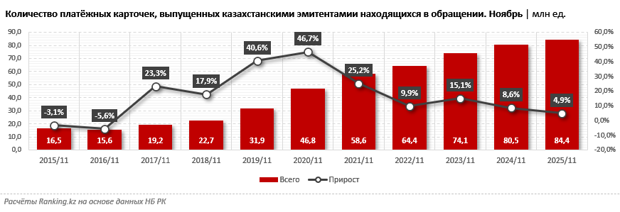 По состоянию на 1 декабря 2025 года количество платежных карт в обращении достигло 84,4 млн, за год рост составил почти 5%. При этом за пять лет количество платежных карт увеличилось на 80,5%, а за десятилетие — более чем в 5 раз.