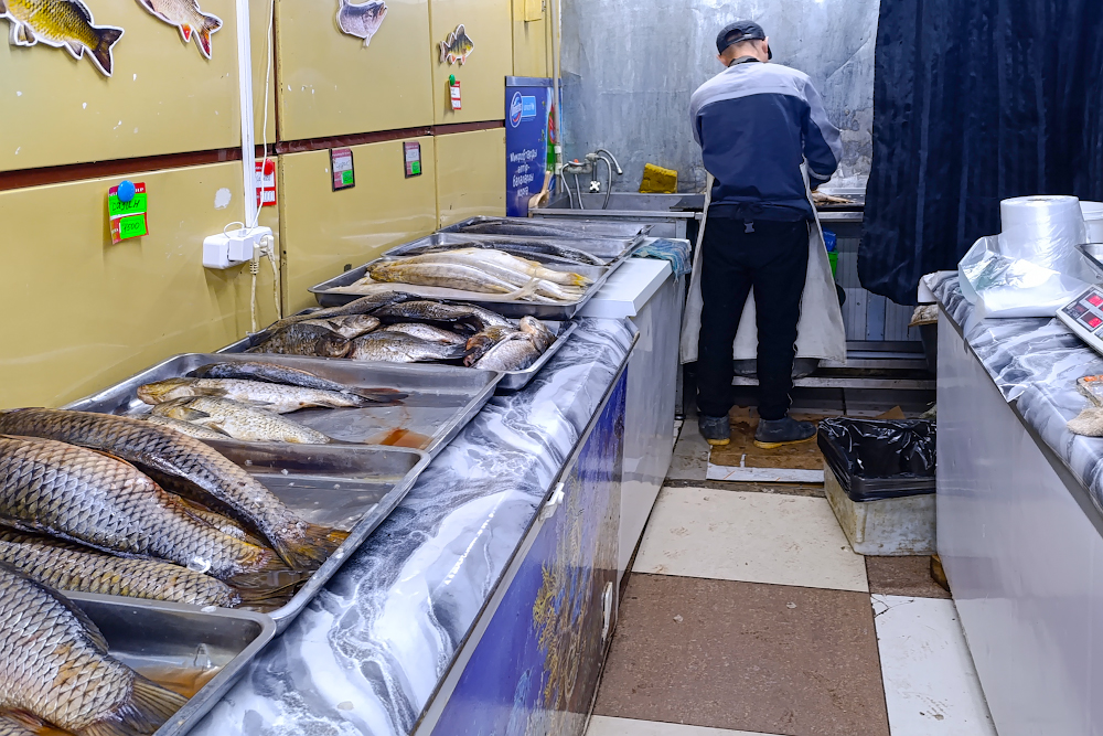 Дешевле здесь можно купить и говяжий фарш – 4300 тенге/кг, как и куриные тушки – 1500 тенге/кг. Говядина на кости здесь стоит 4300 тенге/кг, окорочка – 1965 тенге/кг, баранина – 4200 тенге/кг, конина – 3800 тенге/кг. Десяток яиц I категории на рынке можно купить за 510 тенге. 1500 тенге здесь стоил килограмм мелких сазанчиков, любителям крупной рыбы пришлось бы заплатить за крупных сазанов 2200 тенге/кг.