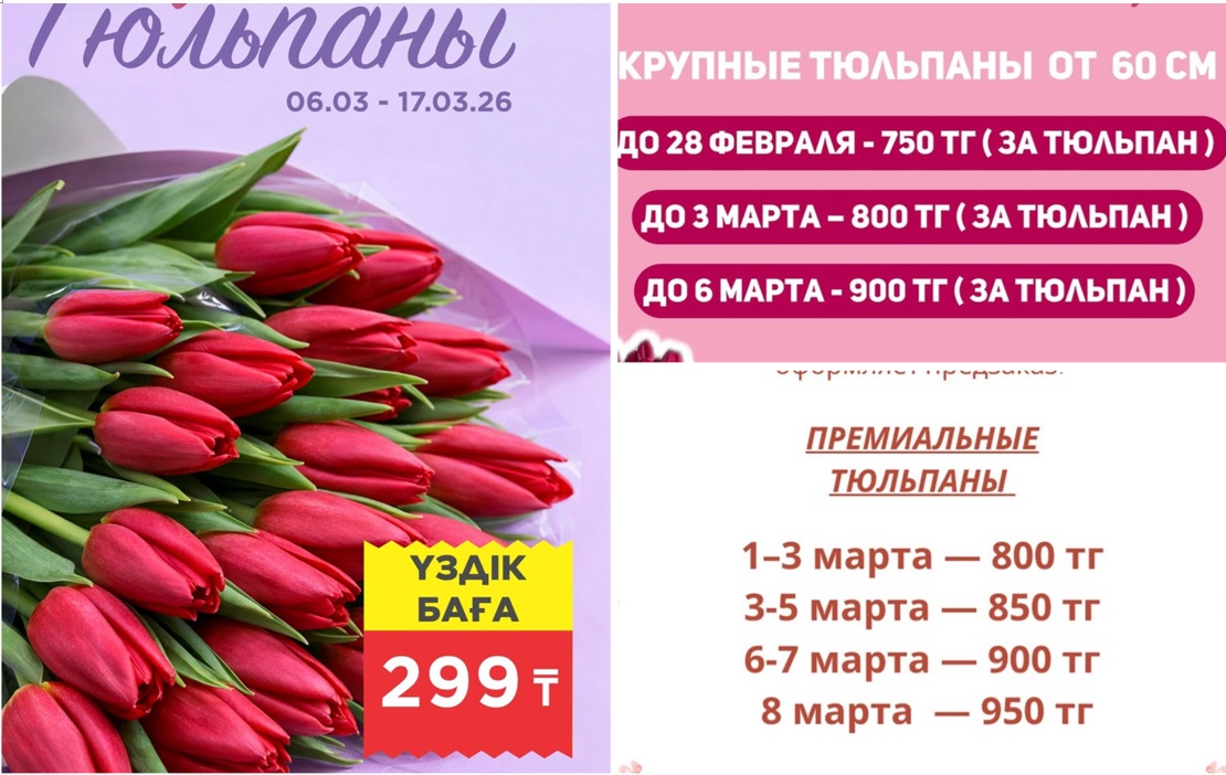 1. Время покупки (эффект "горящих дат"). Как видно из рыночных графиков этого сезона, самые выгодные предложения действуют по предзаказу до конца февраля или в первых числах марта (около 750-800 тг за крупный цветок). Чем ближе заветная дата, тем выше ценник.