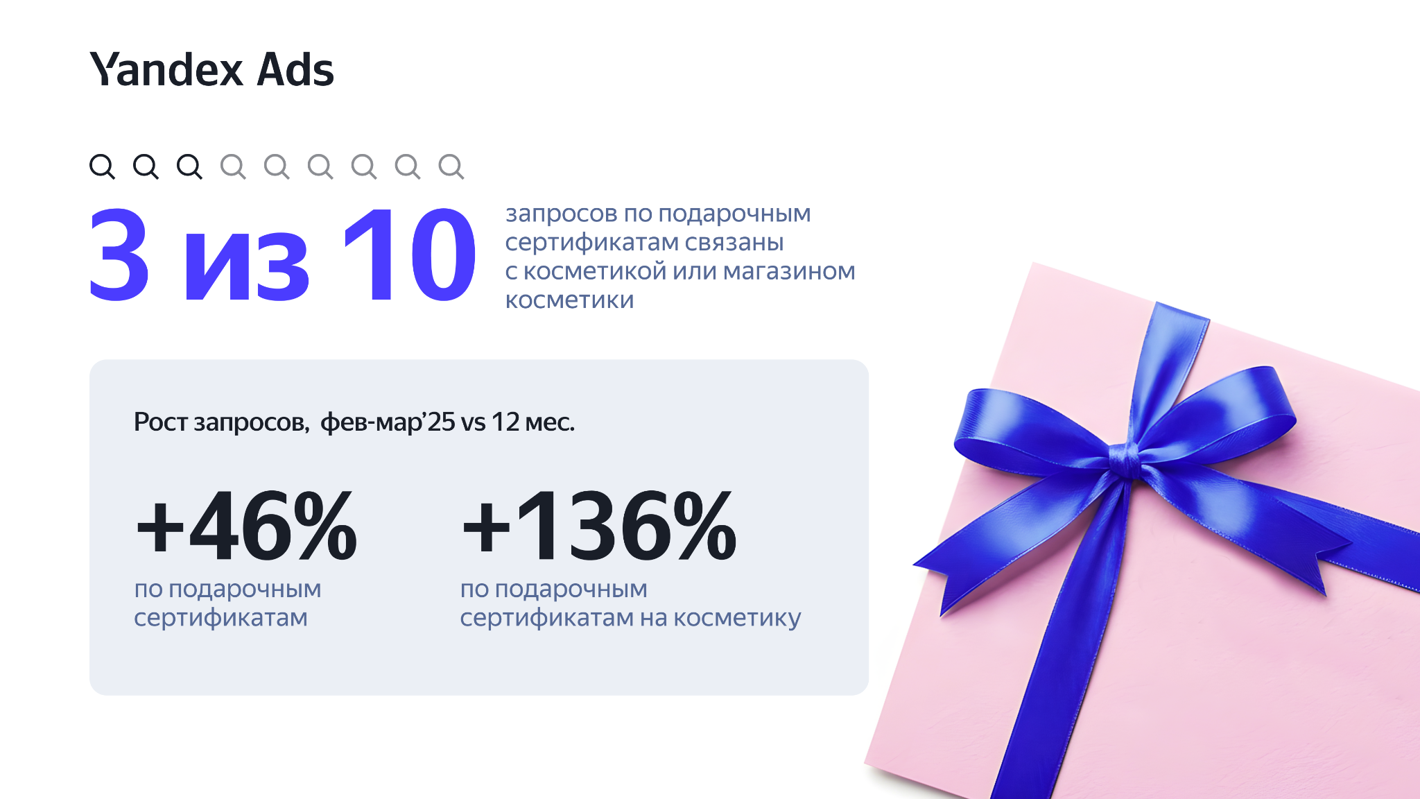 Три из десяти запросов о подарочных сертификатах связаны с косметикой или магазинами косметики. В феврале-марте число запросов о подарочных сертификатах на косметику на 136% выше среднего по году. Растет интерес к спа-услугам (+27%), стайлерам (+35%), электрогрилям (+31%) и устройствам для ухода за собой (+25%).