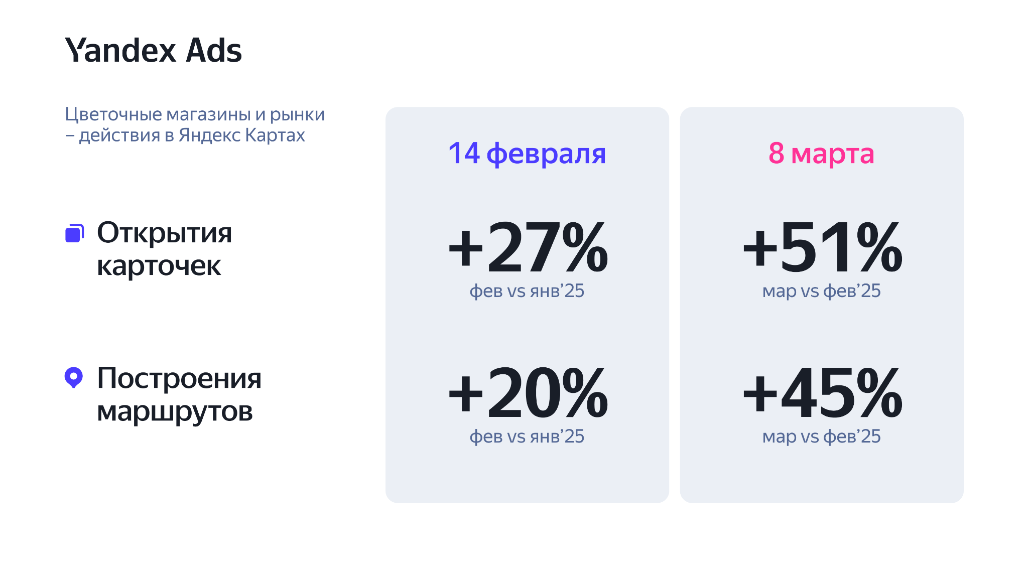 Цветы ищут не только в Поиске, но и в Картах. В феврале пользователи Яндекс Карт открывают карточки цветочных магазинов на 27% чаще, чем в январе. А в марте — в 1,5 раза чаще, чем в феврале.