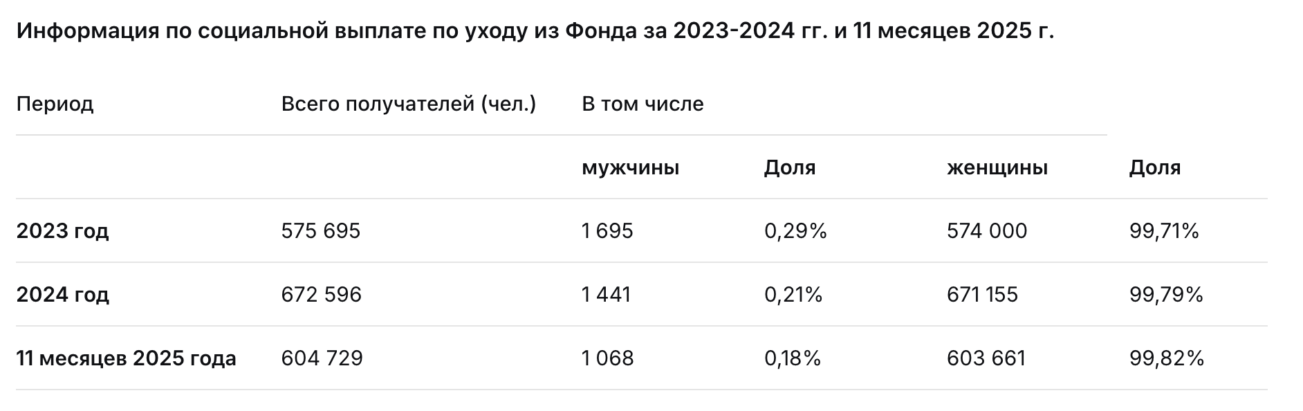 Цифры, предоставленные ГФСС, красноречиво демонстрируют, что существующая норма приводит к тому, что отцы практически не пользуются правом на получение страховой выплаты по уходу. Подавляющее большинство получателей — женщины.