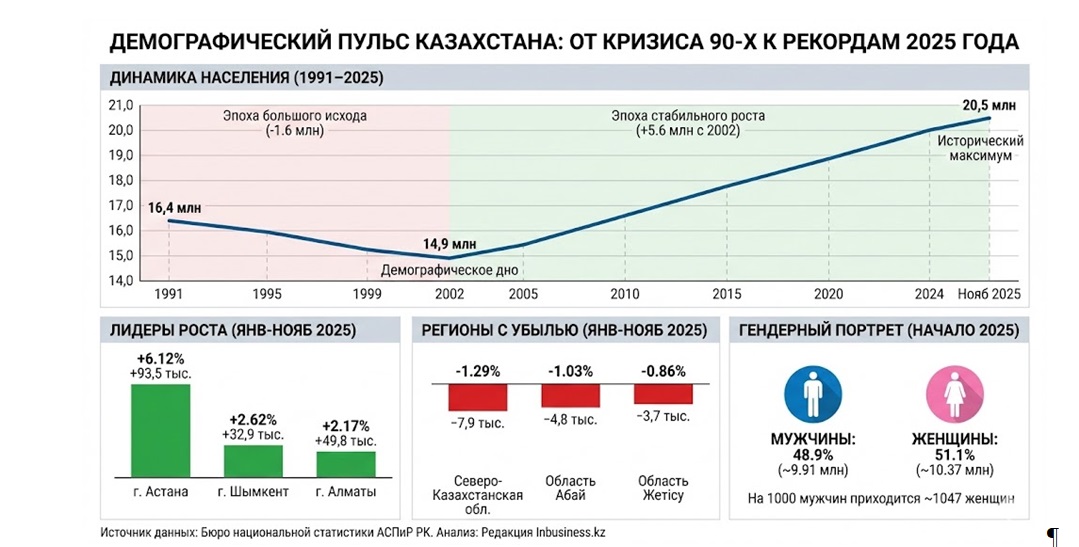 В новейшей истории Казахстана демография стала, пожалуй, самым честным индикатором состояния государства. Если экономические показатели подвержены инфляции и рыночным колебаниям, то цифры населения бескомпромиссны. Редакция inbusiness.kz изучила данные бюро национальной статистики РК за 34 года – с 1991-го по ноябрь 2025-го. Перед нами раскрылась драматичная синусоида: от эпохи "большого спада" до нынешнего исторического максимума.