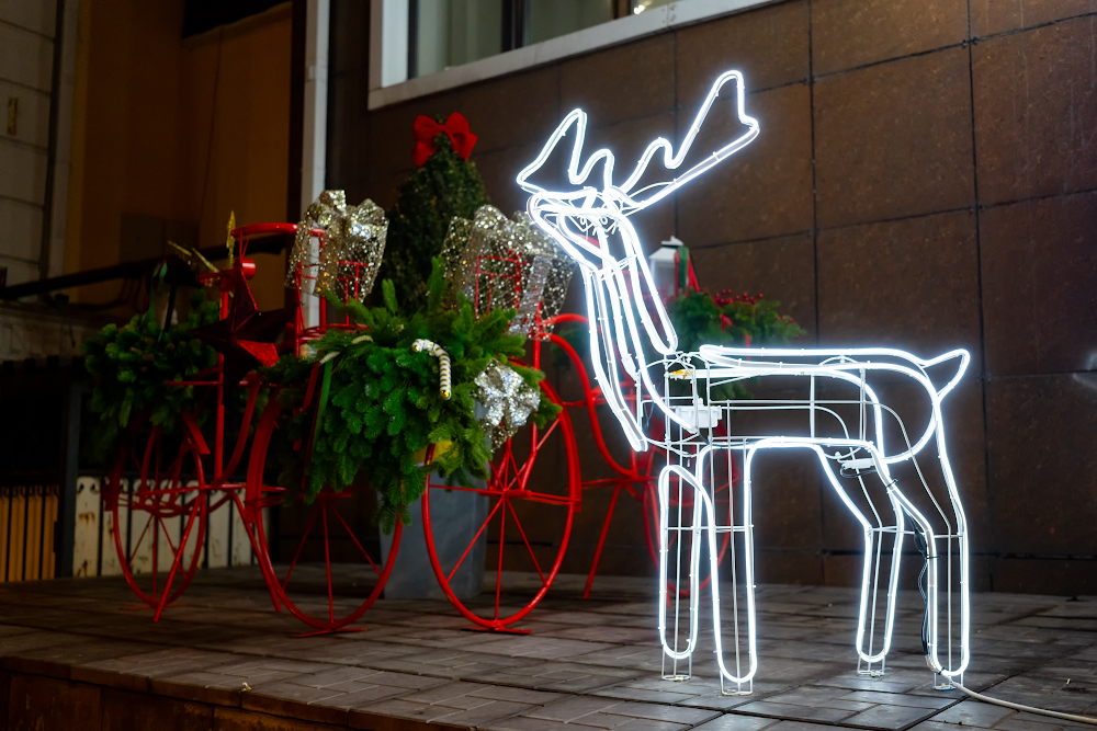 Но, как мы понимаем, каждый предприниматель украшает свое заведение в меру своих вкусов и возможностей. Где-то это будут тысячи огней гирлянд и елка высотой более 10 метров, а где-то простая инсталляция с искусственной хвоей, да светящийся олень из проволочного каркаса.