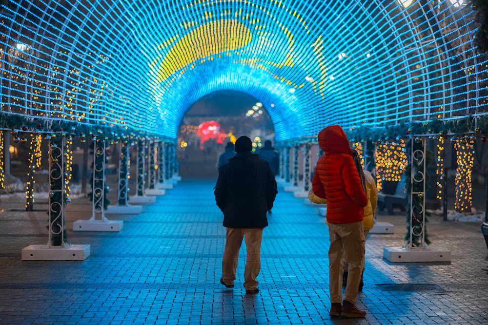 Интересным решением, например, стала интерактивная светящаяся арка, на которой меняется изображения – от поздравления с Новым годом на нескольких языках до развивающегося флага Казахстана.