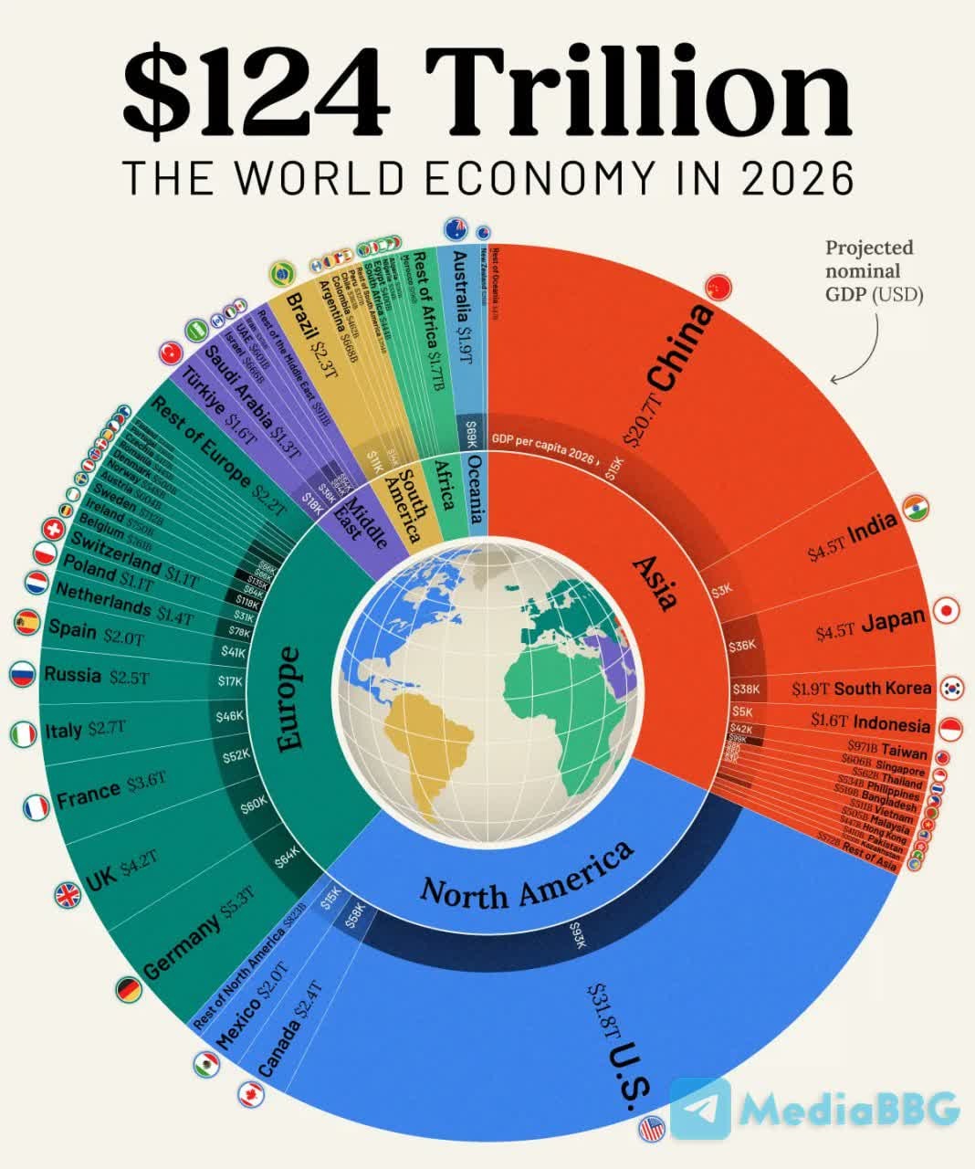 Расстановка лидеров остаётся прежней: США - с прогнозируемым ВВП в $31,8 трлн (по-прежнему крупнейшая экономика мира), Китай - $20,7 трлн, Германия - $5,3 трлн, Индия - $4,5 трлн (удерживает место, обогнав Японию ещё в 2025 году).