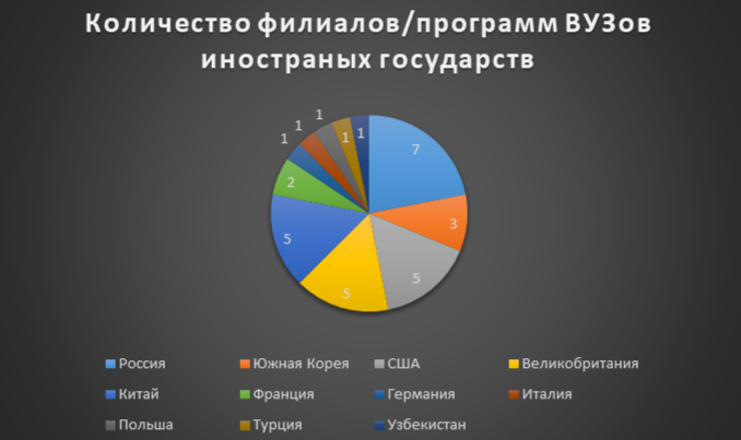 На сегодняшний день в республике уже функционируют 30 представительств иностранных университетов и две Мастерские Лубань (проект КНР по подготовке технических специалистов).