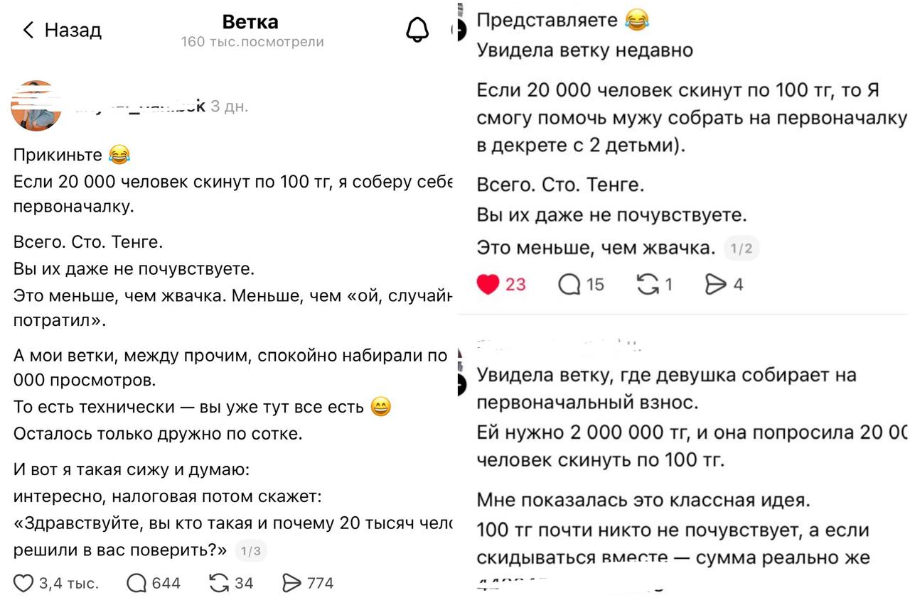 Ленты соцсетей заполнились видео и постами с похожим содержанием: "Нас здесь 20 тысяч человек. Если каждый скинет по 100 тенге (это меньше, чем стоит жвачка), я соберу на первоначальный взнос". Авторы подобных публикаций апеллируют к "коллективному разуму" и магии маленьких цифр, утверждая, что для отправителя сумма незаметна, а для получателя может стать судьбоносной.