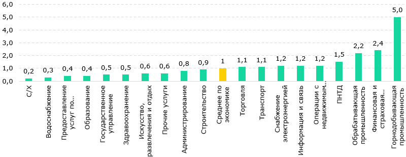 Рис. 2. Производительность труда по секторам относительно среднего значения по экономике