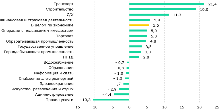 Основной вклад в обеспечение положительной динамики внесли такие секторы, как строительство (+19% г/г) и транспорт (+21,4% г/г), рост в которых был обеспечен фискальным стимулированием и ростом нефтедобычи. Сельское хозяйство также продемонстрировало существенный реальный рост (+11,3% г/г), которое, несмотря на положительную динамику, продолжает иметь наименьший уровень производительности труда в экономике. В целом сельское хозяйство давно демонстрирует положительную динамику; это связано не только с ростом сектора, но и со значительной миграцией работников из него.