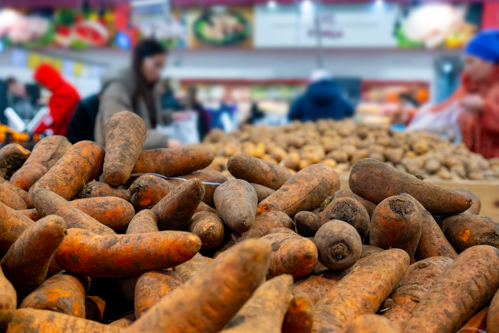 Килограмм картофеля здесь стоит 220 тенге, капусты – 180 тенге, лука – 160 тенге, моркови – 200 тенге. Пакет муки весом 10 килограммов здесь продается по 2990 тенге, в перерасчете на килограмм цена муки составит 299 тенге. Цена пачки соли на рынке – 90 тенге, а литровой бутылки подсолнечного масла – 1000 тенге. За килограмм сахара-песка посетитель рынка заплатит 460 тенге, за килограмм риса – 550 тенге, за килограмм гречневой крупы – 300 тенге. Весовых макаронных изделий на рынке не купить, поэтому в расчет была взята стоимость пакета макарон весом 2 килограмма, которая составила 800 тенге. В перерасчете на килограмм цена продукта составила 400 тенге/кг.