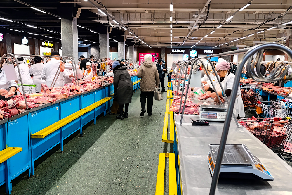 Килограмм весового сахара-песка на базаре можно было купить по той же цене, что и в супермаркете – 420 тенге/кг. Килограммовый пакет соли здесь стоил уже 130 тенге, а булка хлеба – 190 тенге. Килограмм весовой гречневой крупы торговцы продавали за 270 тенге, весового риса – за 330 тенге. Муку первого сорта на рынке можно было купить только в мешках по 5 килограммов за 2750 тенге. В перерасчете на килограмм цена продукта составила 550 тенге/кг. Аналогичная ситуация с ценами на макаронные изделия и на подсолнечное масло. Макароны можно приобрести на рынке только в пятикилограммовой упаковке за 2500 тенге.