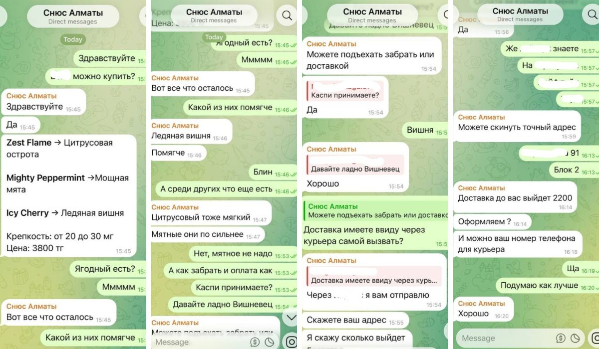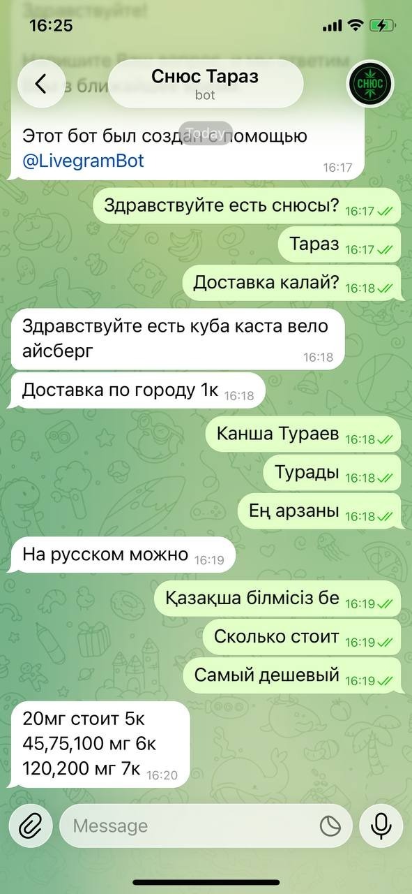 Ни один из них не поинтересовался возрастом покупателя. Ни один не напомнил об ответственности или запрете. Общение как на обычном рынке: есть товар – есть цена, хочешь – бери, не хочешь – проходи мимо. География торговли тоже впечатляет: Астана, Алматы, Шымкент, Тараз, Павлодар, Костанай, Кокшетау и другие города. Блокировки не становятся препятствием. Если один бот исчезает, то вскоре появляется другой. Если контакт удален, его заменяет новый. Получается, запрет убрал продукт из витрины, но теневой рынок работает.