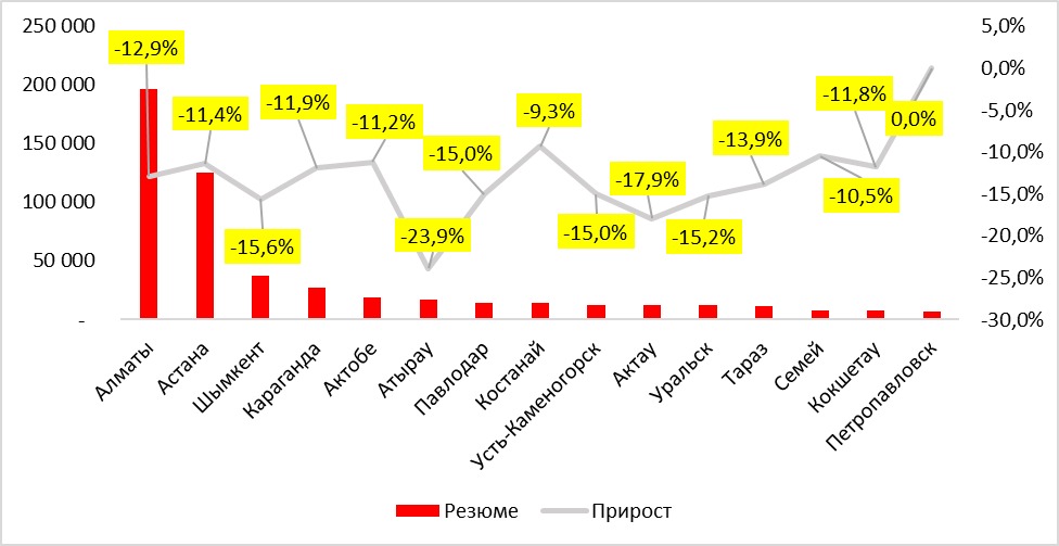 Среди других городов доля размещённых резюме остаётся сравнительно стабильной: Караганда (4,7%), Актобе (3,3%), Павлодар и Костанай (по 2,5%) демонстрируют умеренное снижение в пределах 9–15%. Более заметное сокращение числа резюме зафиксировано в Атырау (–23,9%) и Актау (–17,9%), тогда как в Петропавловске динамика осталась неизменной (0,0%).