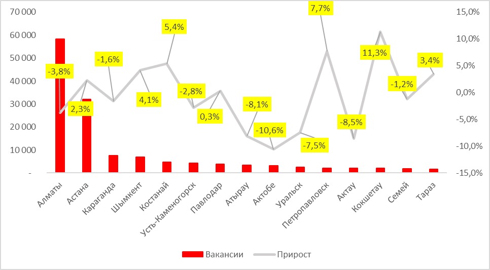 В то же время сокращение числа вакансий наблюдается в Актобе (–10,6%), Атырау (–8,1%), Актау (–8,5%) и Уральске (–7,5%), что может быть связано с завершением сезонных проектов и снижением спроса в ресурсозависимых отраслях.