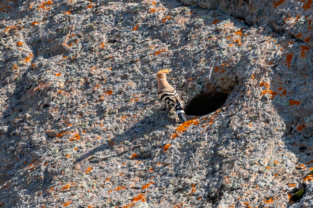 А вот птица с короной на голове – удод, с тревогой присел возле укрытия и гулко ухал, пока позировал для фото, наблюдая не только за людьми, но и за опасностью с неба, которая его тревожила намного больше.