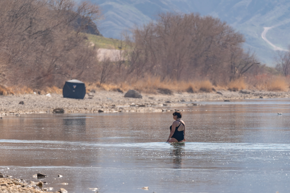 А с берега в воду уже пытались забраться немногочисленные купальщики. Кто-то заходил в воду по колено, кто-то погружался в прохладное течение полностью, пытаясь освежиться под ставшим уже жарким солнцем.