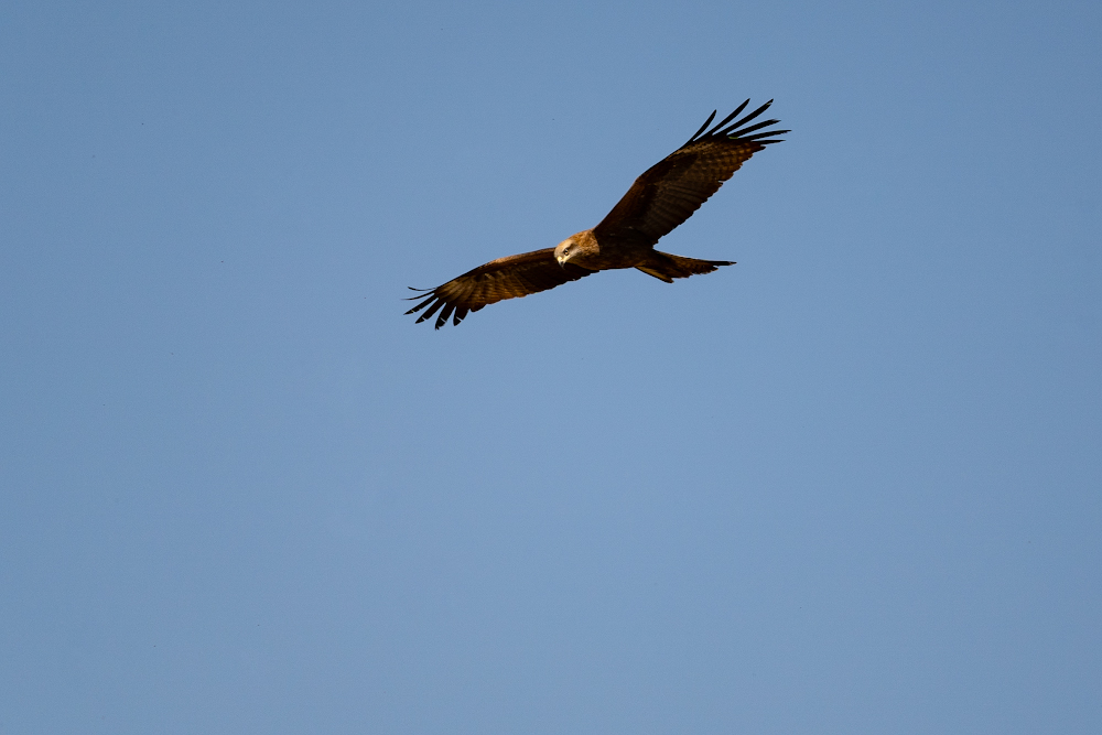 Над берегом реки и прибрежными скалами парила пара черных коршунов, выискивая себе добычу и охраняя гнездо, устроенное в одной из расщелин на вершине скалы. Этот хищник семейства ястребиных охотится за грызунами средних размеров, иногда нападая на зайцев, и не брезгует молодыми птенцами и пресмыкающимися.