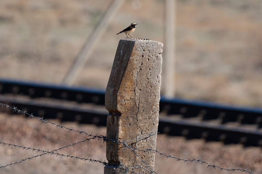 Уже по дороге домой в объектив фотоаппарата попалась еще одна птица каменка, на этот раз – каменка-плешанка, черную голову которой украшает белая плешь. Посидев на столбе до прихода поезда, она упорхнула куда-то по своим птичьим делам, оставив нас с массой впечатлений от загородной прогулки.