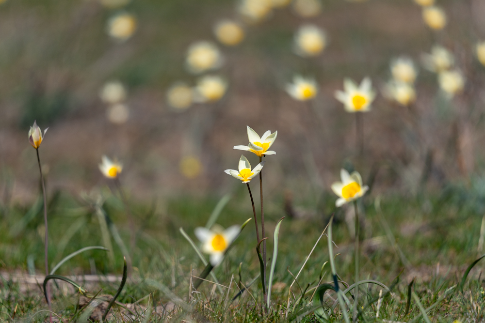 А степи уже начали покрываться зеленым ковром с цветочными узорами. Первыми зацвели самые мелкие, двухцветковые тюльпаны. После зимней спячки вылезли на солнце и пресмыкающиеся, например черепахи.
