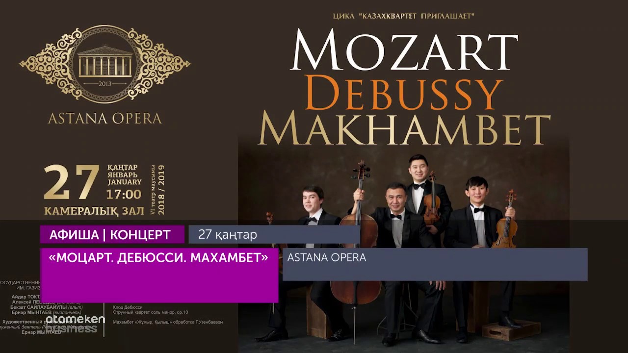 1) Театр - Abai "Jan"; 2) Концерт - "Мен жалындап өтемін" музыкалық әдеби кеші; 3) Опера - Флория Тоска; 4) Концерт - BTS: Love Yourself Tour in Seoul; 5) Театр - "Лифт" драмасы; 6) Концерт - Mozart Debussy Makhambet.