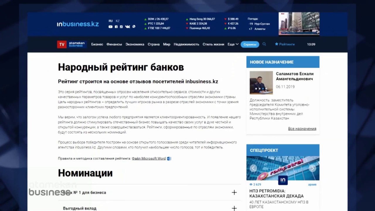 В канун Дня национальный валюты на информационном портале Inbusiness появился новый раздел «Рейтинги». Читатели смогут сами выбрать своих героев в мире бизнеса. И уже сегодня начался старт голосования аудитории по поиску лучшего банка по 10 номинациям. Цель народных рейтингов – определить лучших игроков рынка в разрезе отраслей экономики с точки зрения разносторонних клиентских предпочтений. Появление же рейтинга Inbusiness должно стимулировать отечественный бизнес повышать качество своих услуг в духе честной и открытой конкуренции. Что касается выбора победителя, то сам процесс построен на основе открытого голосования среди читателей информационного агентства inbusiness.kz. Поэтому голосуем активнее!