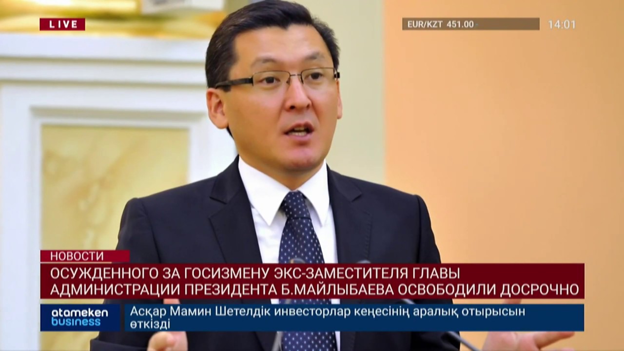 Бывший заместитель руководителя администрации президента Казахстана Баглан Майлыбаев вышел на свободу досрочно. Такую информацию распространил ряд СМИ со ссылкой на столичный департамент уголовно-исполнительной системы. СЛАЙД: По их данным, Майлыбаев был освобожден из следственного изолятора еще 30 мая этого года, ровно за 1 год и 4 месяца до отбытия полного срока. Журналистам даже удалось свящаться с отцом Майлыбаева, который отметил, что, цитирую, «самочувствие сына нормальное». При этом, в пресс-службе городского суда Нур-Султана информацию о досрочном освобождении бывшего высокопоставленного чиновника комментировать наотрез отказались, не объяснив причин. ЗКТ: Напомним, в 2017 году бывший заместитель главы Администрации Президента был обвинен в незаконном сборе, распространении и разглашении госсекретов. После доказательств вины, его осудили сроком на пять лет.