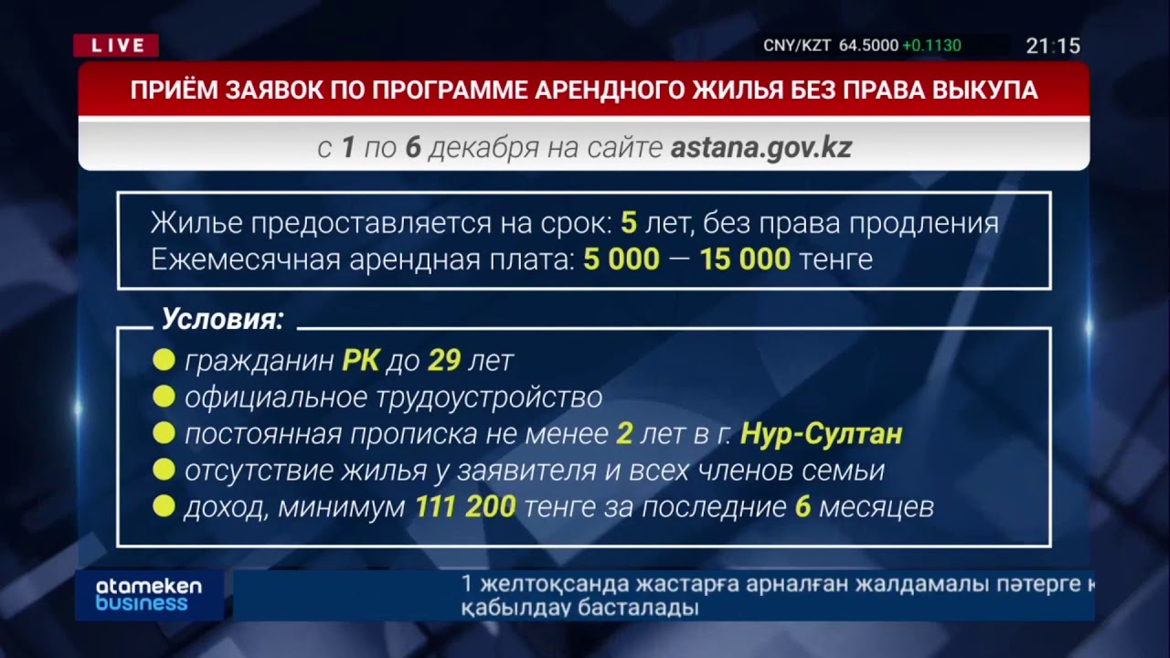 В столице начался приём заявок на аренду жилья без права выкупа. Конкурс продлится до 6 декабря, сообщили в городском акимате. Программа предназначена для работающей молодежи с заработной платой не менее 111 тысяч тенге за последние полгода. Кстати, в акимате пообещали закрыть глаза, если претендент потерял доход из-за пандемии. Если вы предоставите выписку с банковской карты по получению социальной помощи в размере 42 500 тенге, то вы можете подать заявку. Напомню, согласно правилам, плата за аренду составляет до 15 тысяч тенге в месяц. Договор заключают до 5 лет.