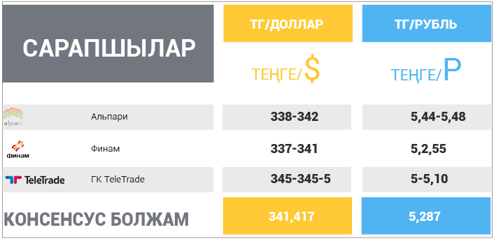 Алдағы аптада теңгенің рубльге қатысты бағамы 5,2-5,5 теңге, долларға қатысты бағамы 337-341 теңге және еуроға қатысты бағамы 392-395 теңге болады деп болжап отырмыз.