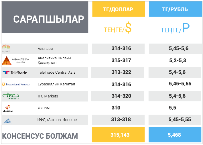 Біздің болжамымыз бойынша, теңгенің долларға қатысты бағамы, 314-316 теңге деңгейінде, ал теңгенің рубльге қатысы бағамы 5,45-5,6 теңге ауқымында болады. Мұнай бір баррель үшін 50-51,5 доллар болатын шекте саудаланады, алайда қара алтын әзірге 50 доллар болатын деңгейге жете қойған, мұндай баға мұнай валютасының нығая түсуіне себеп болмайды. бағаланатын