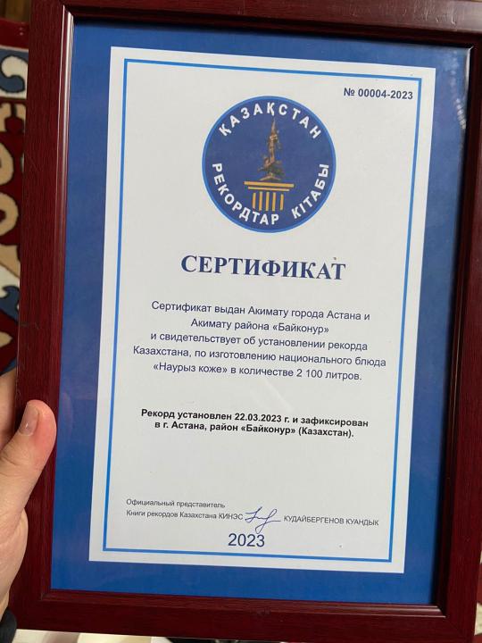 Қазақстан рекорды орнатылғанын куәландыратын сертификат Астана әкімдігіне және Байқоңыр ауданының әкімдігіне берілді. Барлығы 2 100 литр наурыз көже дайындалды. Рекорд 2023 жылдың 22 наурызында тіркелді.