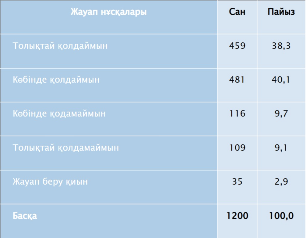 Осының нәтижесі ретінде сауалнамаға қатысқан азаматтардың басым көпшілігі алдағы конституциялық реформаны қолдайтынын білдіреді. Жалпы алғанда, бұл – респонденттердің 78,4%-ы, олардың 40,1%-ы реформаны "көбіне қолдайды", ал 38,3%-ы "толық қолдайды". Бұл көрсеткіштер өз кезегінде реформаның уақтылы әрі қоғам тарапынан сұранысқа ие екенін растайды.