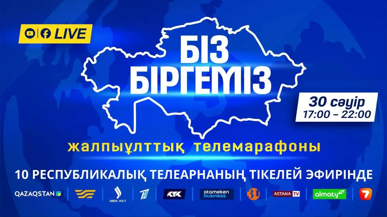 30 сәуір күні, Бірлік күні қарсаңында алғаш рет 10 республикалық телеарнаның тікелей эфирінде "Біз біргеміз" жалпыұлттық телемарафоны өтеді, деп хабарлайды inbusiness.kz сайты.