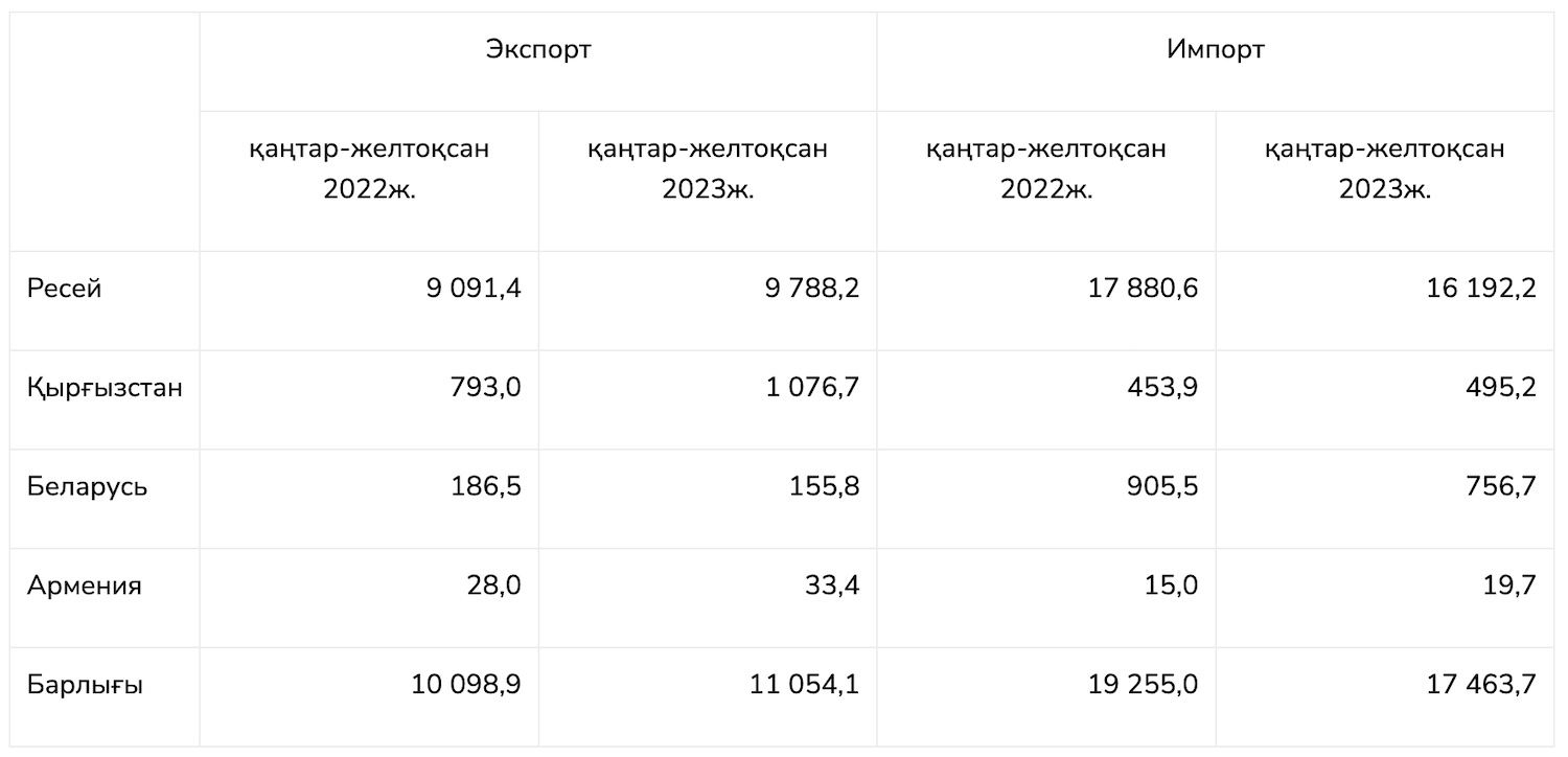 Қазақстан Республикасының ЕАЭО елдерімен сыртқы сауда айналымының жалпы көлемінде Арменияға 0,2%, Беларусқа – 3,2%, Қырғызстанға – 5,5%, Ресейге 91,1% тиесілі.ё