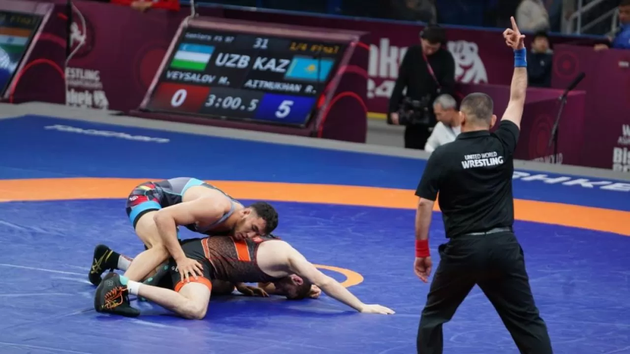 Финалда Ризабек Айтмұхан 97 келі салмақтағы әлем чемпионы Ахмед Тажудиновпен белдседі.