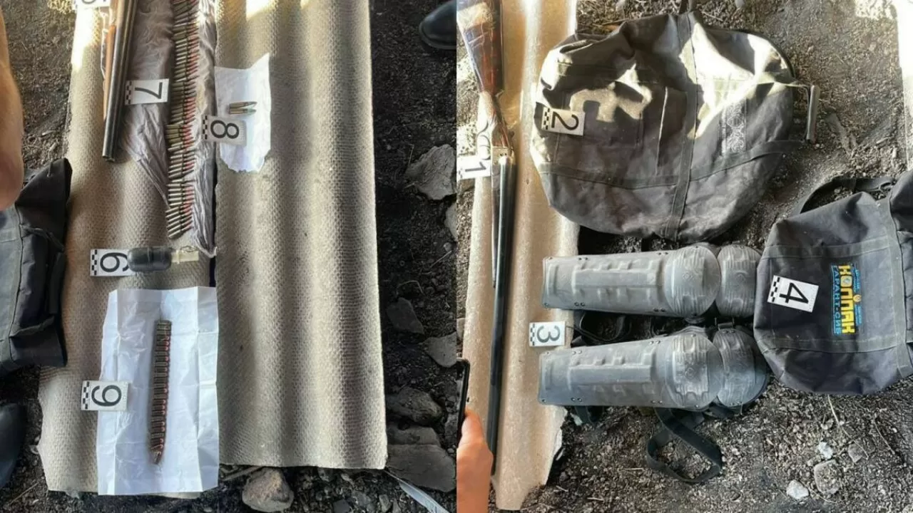 Табылған сөмкенің ішінен 12 калибрлі ИЖ екі ұңғылы тегіс ұңғылы мылтық, 12 калибрлі ТОЗ-63 кесілген қос ұңғылы мылтық, жарық шу гранатасы, 91 түрлі калибрлі патрон, 1 жұп тізе таңғыш және дене сауытының қабы табылды.