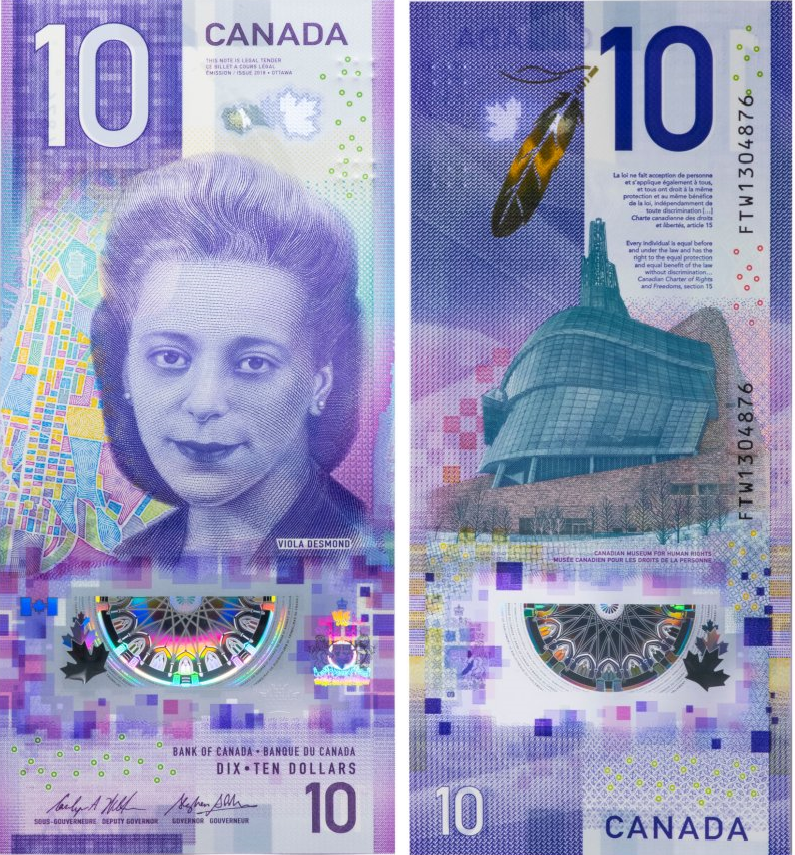 Мысалы, 10 долларлық банкнот "сурет" форматында жасалған. Алдыңғы бетінде нәсілдік кемсітушілікке қарсы күрестің символына айналған канадалық кәсіпкер әрі қоғам қайраткері Виола Десмондтың бейнесі бар. Артқы бетінде – Виннипег қаласындағы Адам құқықтары музейі. Канада банкі келесі 2027 жылы да тік форматта болатын жаңа 20 долларлық банкнот шығаруды жоспарлап отырғанын жария етті.