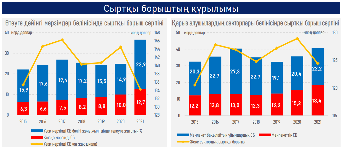 Сонымен қатар сыртқы борыштың өсуі мемлекеттік және квазимемлекеттік сектормен қамтамасыз етілді, ал жеке сектордың сыртқы міндеттемелері айтарлықтай төмендеді. 2022 жылғы 1 қаңтарға Үкімет пен квазимемлекеттік сектор ұйымдарының соңғы 7 жылда сыртқы борышының Ұлттық қордың валюталық активтеріне барынша жоғары қатынасы тіркелді. Мемлекеттің тікелей және шартты сыртқы міндеттемелерінің ұлғаюы оны қаржыландырудың қосымша көздерін ("қарыз тұзағы"деп аталатын) талап ете отырып, бюджетке ауыртпалық түсіруі мүмкін.