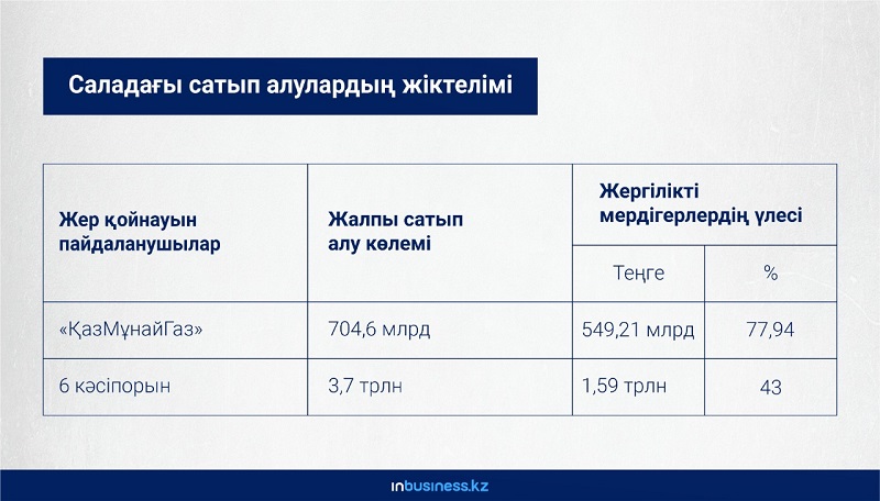 2020 жылы мұнай саласында орындалған тапсырыстың 79%-ын "Теңізшевройл", "Қарашығанақ Петролиум Оперейтинг", North Caspian Operating Company, "Тотал", "Сайғақ", "Жайықмұнай" компаниялары шығарған. Ақшалай есептесек, бұл 4,28 трлн теңгеден асады. Отандық жеткізушілер мен мердігер компаниялар соның 1,65 трлн теңгесін игеруген. Яғни, аталмыш мұнай алпауыттары барлық сатып алудың 38,5%-ын жергілікті компанияларға берген болып шығады.