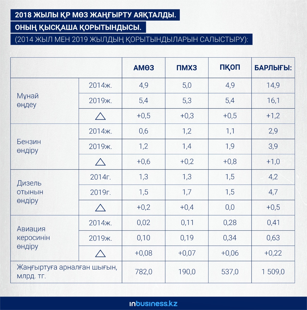 Айтылғанның бәрін қорытындылай келе, қазақстандық мұнай өңдеуді жаңғырту сәтті өтті деген түсінік бергім келеді. Оның нәтижелері мен жалпы экономикаға оң әсері күмән тудырмайды. Мұнайшылар белгілеген барлық мақсат орындалды.