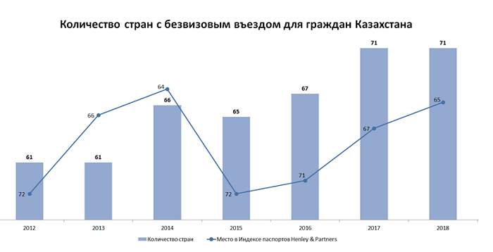 Қазақстандық төлқұжат иелері 2018 жылы әлемнің 71 еліне визасыз бара алады. Жеті жыл ішінде бұл көрсеткішке 10 ел қосылған. Henley&Partners халықаралық консалтингтік компаниясы өзінің жыл сайынғы төлқұжаттар индексінде осындай мәлімет келтірді. 2018 жылдың рейтингінде Қазақстан Беларусь және Оманмен 65-орынды бөлісіп, былтырғы жылға қарағанда екі саты көтерілген. Бірақ та визасыз баратын елдер саны көбейген жоқ. Алайда соңғы жылдары қазақстандықтардың визасыз баратын елдерінің саны тұрақты өсіп келеді. 2015 жылы қазақстандықтар 65 елге визасыз бара алған болса, 2016 жылы 67 елге, 2017 жылы 71 елге жеткен.