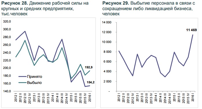 Сол ресми мәліметтер бойынша еліміздің ірі және орта кәсіпорындарында 2016 жылдың I тоқсанында еңбек ресурстарын қабылдау мен шығарудың біршама бәсеңдеуін байқауға болады. Мысалы, 2012 жылы бір тоқсанда жұмысқа 300 мың адамға дейін қабылданса, ал 2016 жылдың I тоқсаны қорытындысы бойынша жұмысқа 154 мың адам қабылданған. Сонымен қатар, 2015 жылы басталған трендті атап кетуге болады, ол кезде жұмыстан шыққан адамдардың саны жұмысқа қабылданғандардан асып кеткен, ал 2016 жылдың I тоқсаны осы көрсеткіштер арасындағы -38725 "алшақтықты" көрсетеді. Сонымен қатар, ірі және орта кәсіпорындардан жұмысшы күшінің шығуы қысқартуға немесе бизнесті таратуға байланысты артып отырғаны айтарлықтай кері тренд болып табылады.