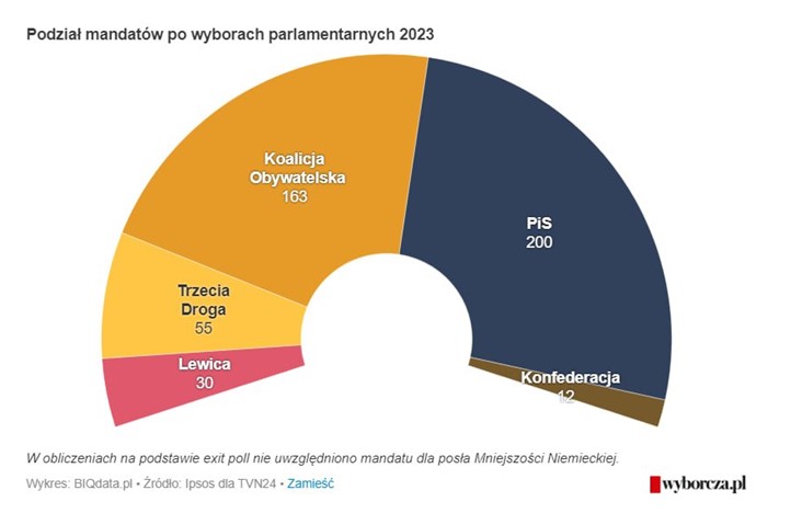 Экзитпулдардың алдын ала қорытындылары бойынша "Құқық және Әділеттілік" Парламенттің төменгі палатасында 200 мандат, "Бұқаралық коалиция" – 163, "Үшінші жол" – 55, "Жаңа солшылдар" – 30, "Конфедерация" – 12 мандат қана алуы мүмкін.