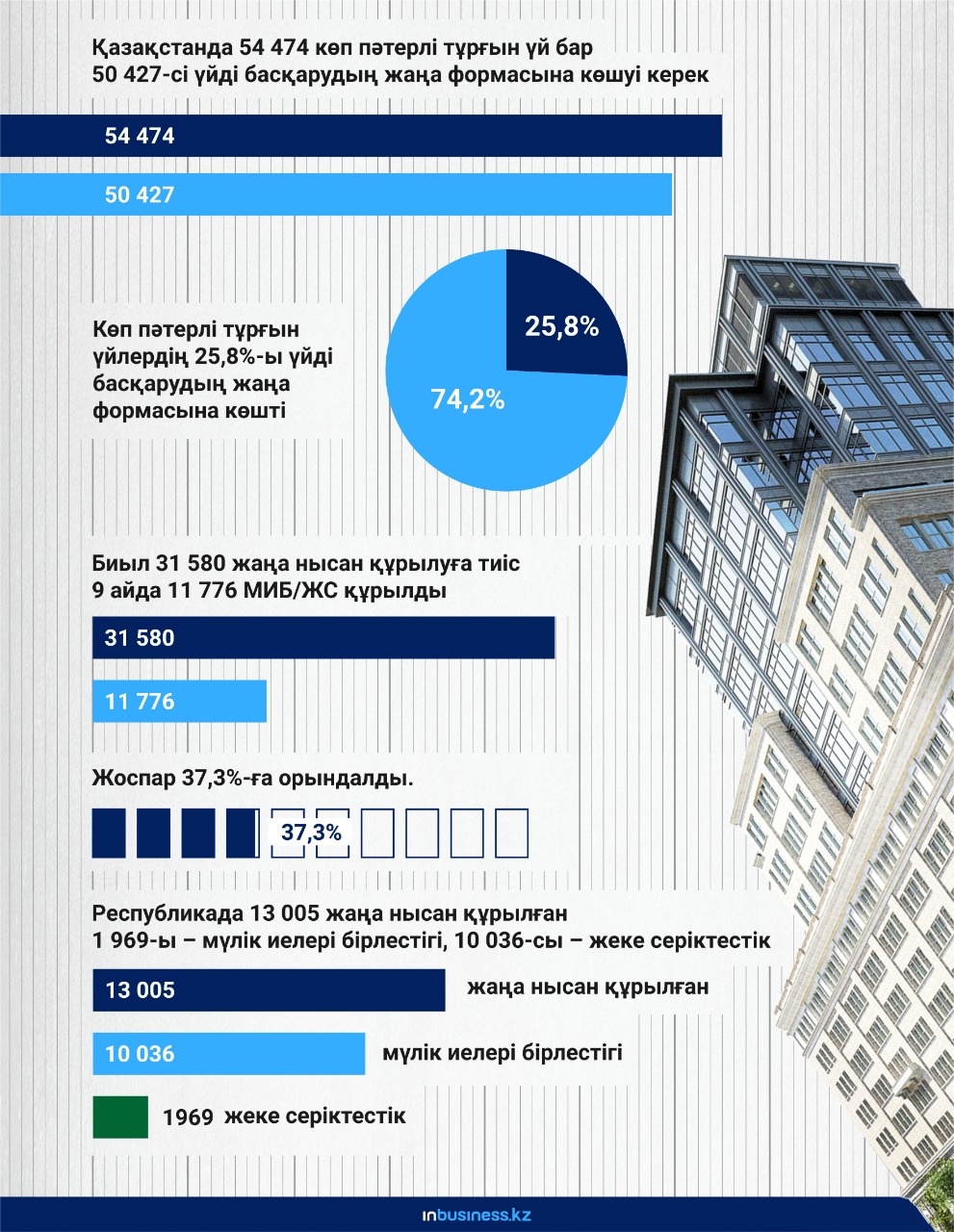 Индустрия және инфрақұрылымдық даму министрлігінің мәліметіне сүйенсек, Қазақстанда 54 474 көп пәтерлі тұрғын үй бар. Соның 50 427-сі үйді басқарудың жаңа формасына көшуі керек. 2021 жылдың 30 қыркүйегіндегі жағдай бойынша, республикада тұрғын үйді басқарудың 13 005 жаңа нысаны құрылған. Оның 1 969-ы – мүлік иелері бірлестігі, 10 036-сы – жеке серіктестік. Сонда қолданыстағы көппәтерлі тұрғын үйлердің тек 25,8 пайызы ғана үйді басқарудың жаңа формасына көшкен.