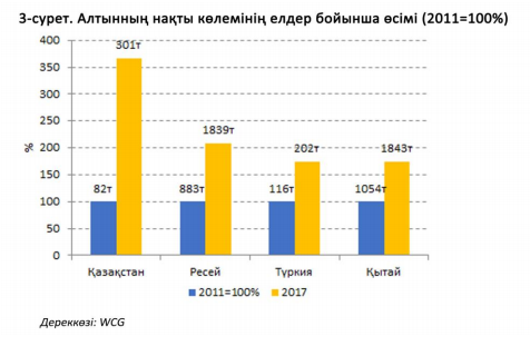 Салыстырмалы түрде алғанда Қазақстан қордағы алтынның өсу көлемі бойынша көшбастап, сатып алудан абсолютті мәнде Ресей (соңғы алты жылда +956 тонна) мен Қытай (соңғы алты жылда +789 тонна) басымдыққа ие. Реттеушінің мәліметіне сүйенер болсақ, Ұлттық банктің алтын-валюта қорындағы алтынның үлесі 42%-ға жеткен. Ұлттық банк қорындағы жиналған алтынның нақты көлемі Саудия көрсеткішін басып озып, әлемнің орталық банктері арасында 15-орынды иеленді.