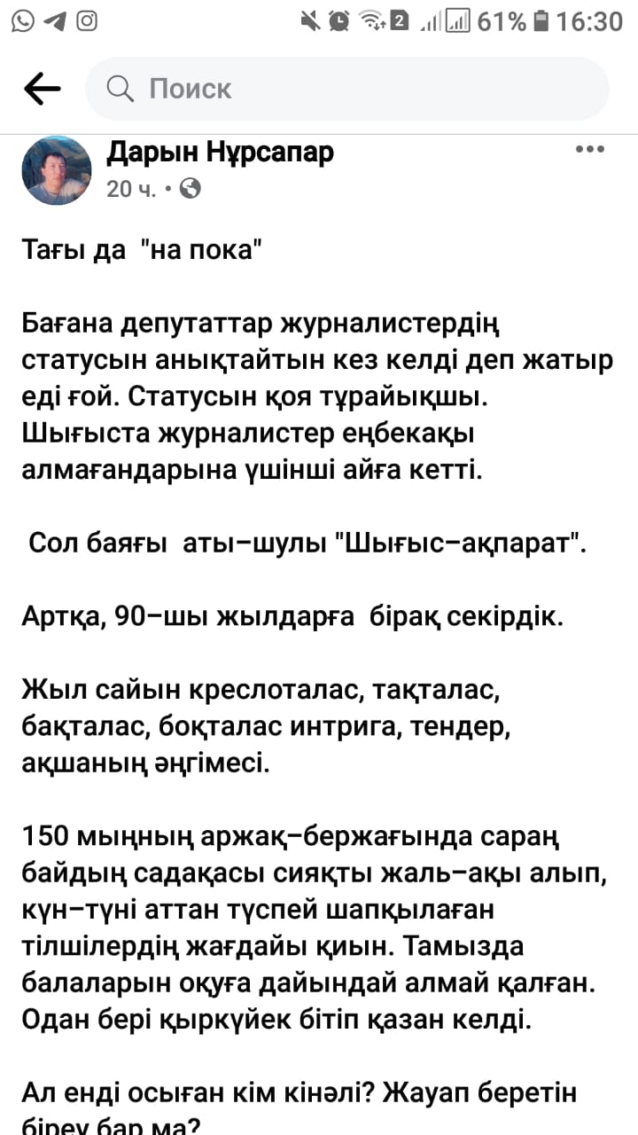 "Идеология саласында үлкен жұмыс атқарып отырған білімді де білікті мамандар жалақыға жарымай отыр. Шерағаңша айтсақ, "арқалағаны – алтын, жегені – жантақ". Айтуларынша, тамыздан бері еңбекақыларын ала алмаған. Там-тұмдап беруі беріпті. Бірақ мынау заманда тиын-тебенген жан бағу мүмкін емес. Бүгінгі күнге дейін аталған кәсіпорынның қызметкерлері шыдамдылық танытты. Күні кеше ғана әлеуметтік желіде шу шықты.