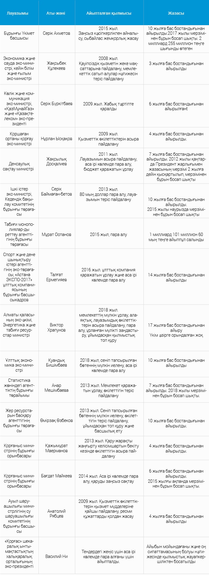 "Коррупция қауіпті вирус сияқты қоғамды ішінен кеміреді, тек нақты тұлғаның ғана емес, тұтас ұлттың рухани деградациясына соқтырады. Кейінгі жылдары қылмыстық жазаға тартылған биліктің биік лауазымды өкілдерінің саны бүкіл кеңес өкіметі тұсындағыдан асып кетті. Және аттары-атақтары қандай: экс-премьер Серік Ахметов, қоршаған ортаны қорғау экс-министрі Нұрлан Ысқақов, денсаулық сақтау министрі Жақсылық Досқалиев, білім және ғылым министрі Жақсыбек Құлекеев, көлік және коммуникация министрі Серік Бүркітбаев, энергетика және табиғи ресурстар министрі Виктор Храпунов, ішкі істер министрі, кейін кеден басшысы Серік Баймағанбетов, спорт және туризм министрі, артынша ЭКСПО-2017 ұлттық компаниясының басшысы Талғат Ермегияев деп тізбелей беруге болады", – дейді профессор Сағындық Жүрсімбаев.